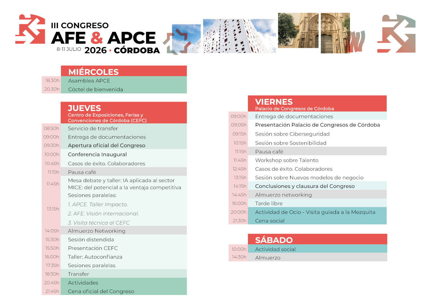 El congreso se estructurará en torno a tres grandes ejes que marcarán el desarrollo de las distintas jornadas: la innovación hacia nuevos horizontes, el talento y un horizonte común. A lo largo del programa se combinarán espacios de reflexión, encuentros profesionales y actividades sociales en algunos de los lugares más emblemáticos de Córdoba, acompañando así el recorrido temático del Congreso.